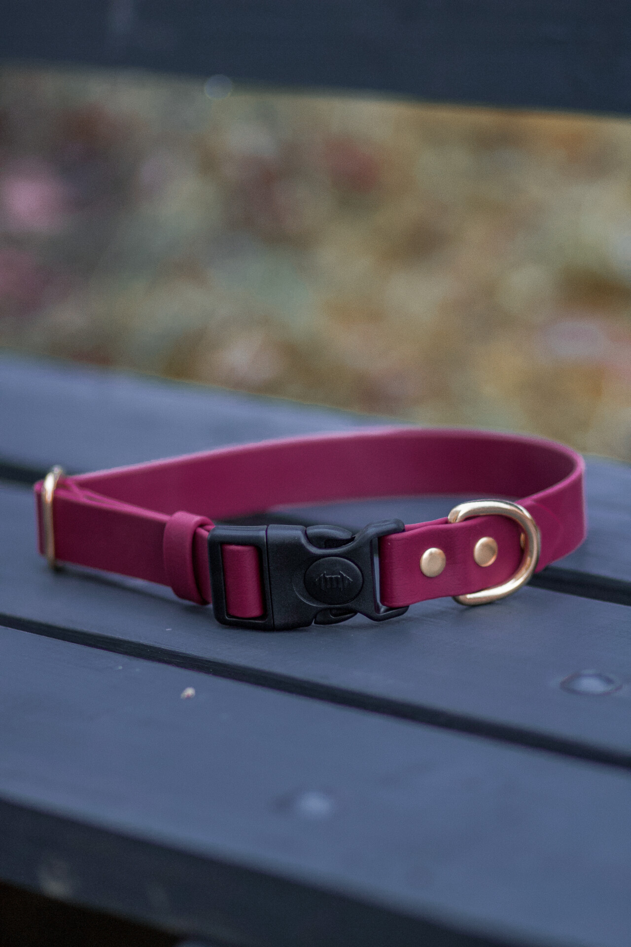 Zdjęcie przedstawia obrożę w kolorze Burgundy Blossom. Na ten moment akcesoria spacerowe z oryginalnego BioThane ® są dostępne w pojedynczych kolorach 🙂