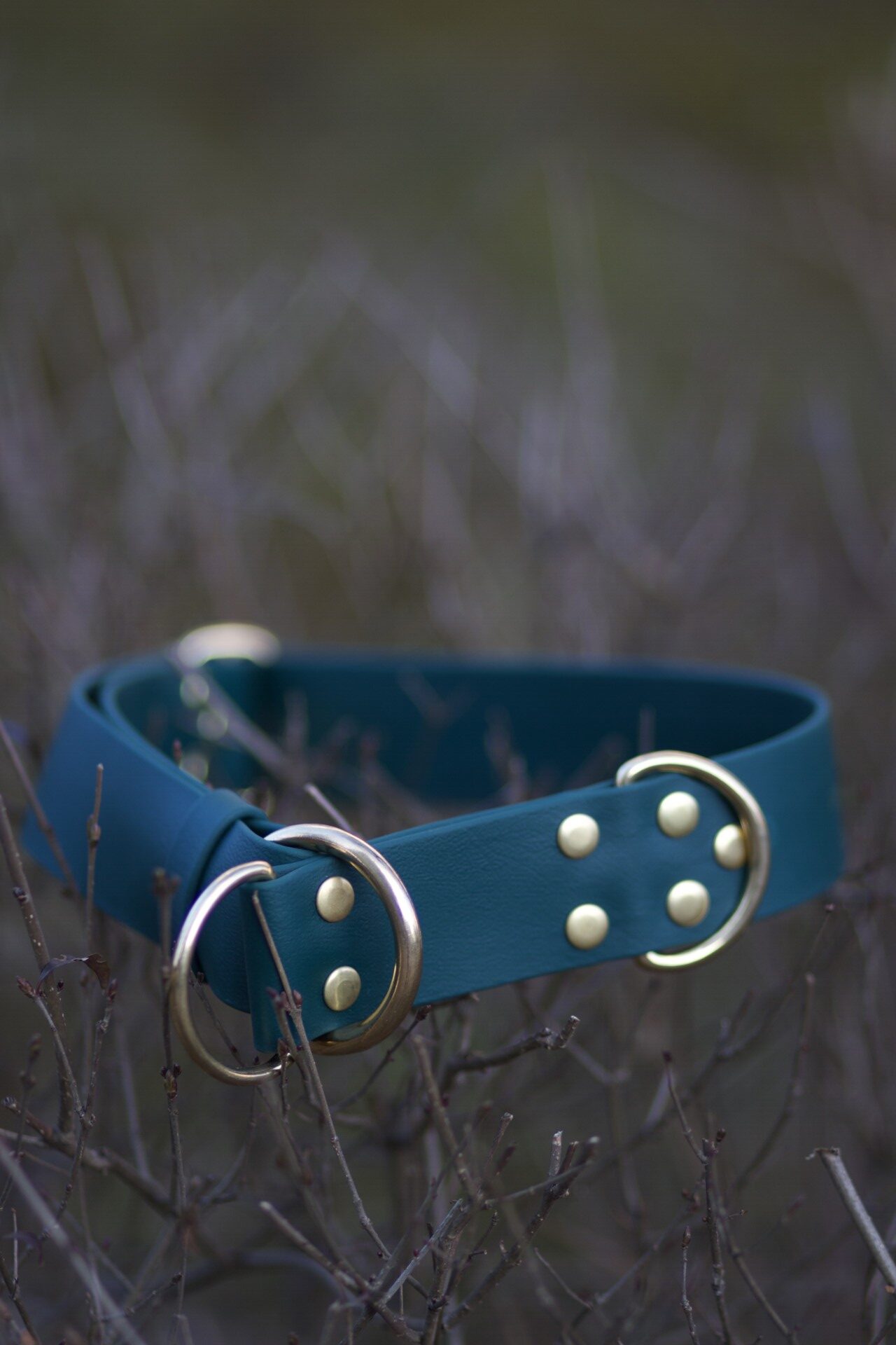 Zdjęcie przedstawia obrożę w kolorze Emerald Forest w szerokości 38mm. Na ten moment akcesoria spacerowe z oryginalnego BioThane ® są dostępne w pojedynczych kolorach 🙂