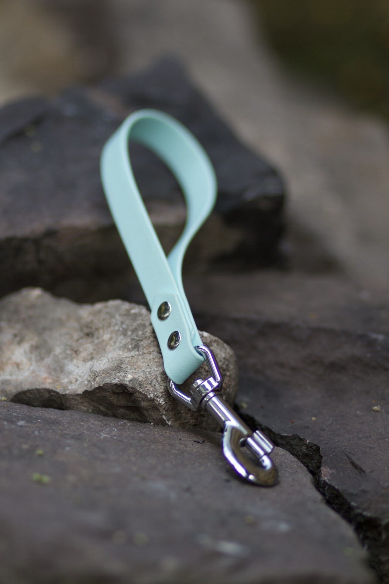 Smycz z wodoodpornej taśmy TPU/PVC nie chłonie wody i błota, nie przeciera się i nie zaciąga.