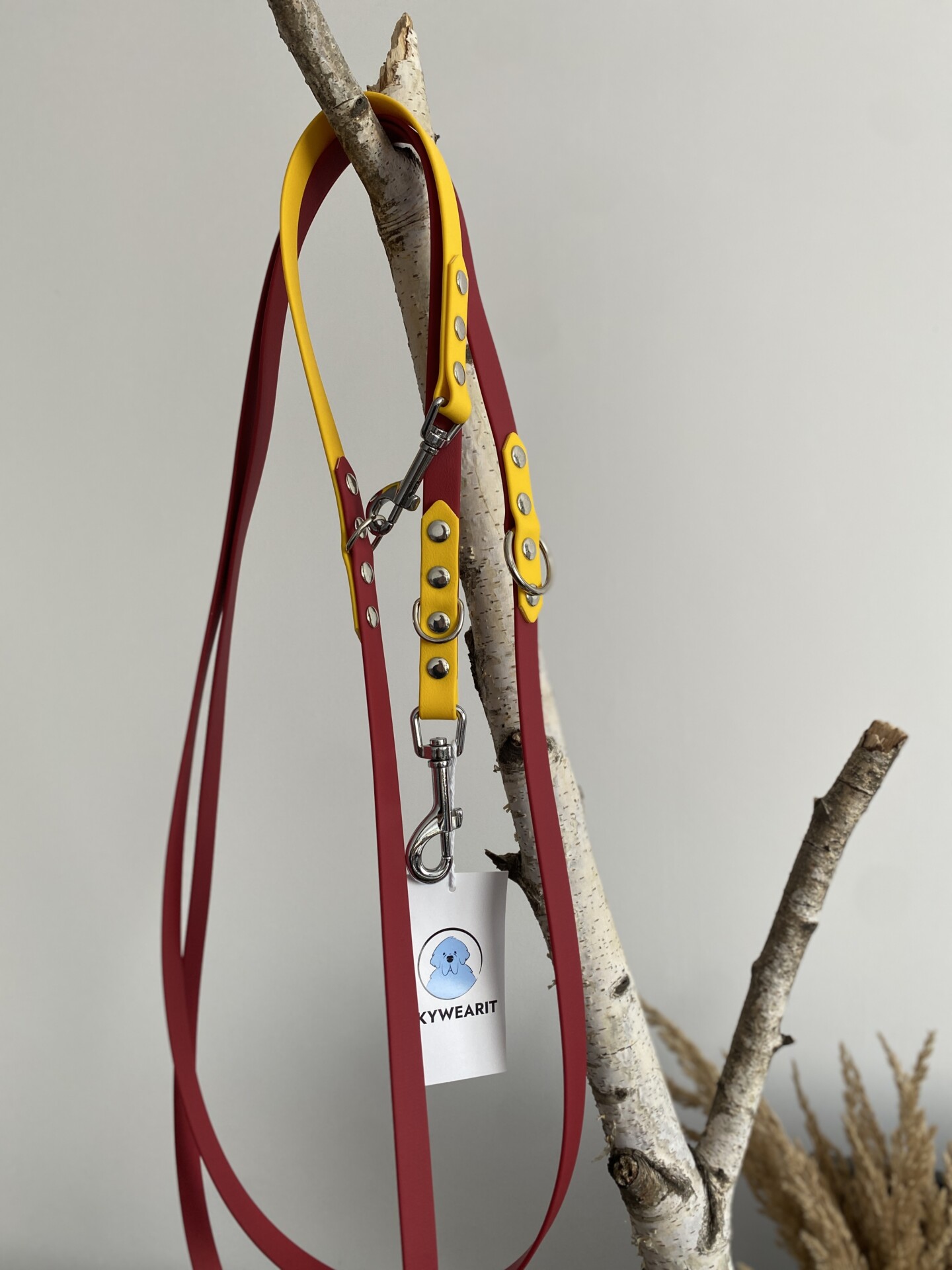 Smycz przepinana w kolorze bordo z żółtym, to idealne rozwiązanie dla każdego psiarza – posiada 3 opcje zmiany długości (można np. przełożyć ją przez ramię i mieć wolne ręce, skrócić lub wydłużyć kiedy jest taka potrzeba). Zbudowana jest z wodoodpornej taśmy, 2 karabińczyków oraz 3 kółek/półkółek, aby móc w każdej chwili wygodnie zmienić jej długość.