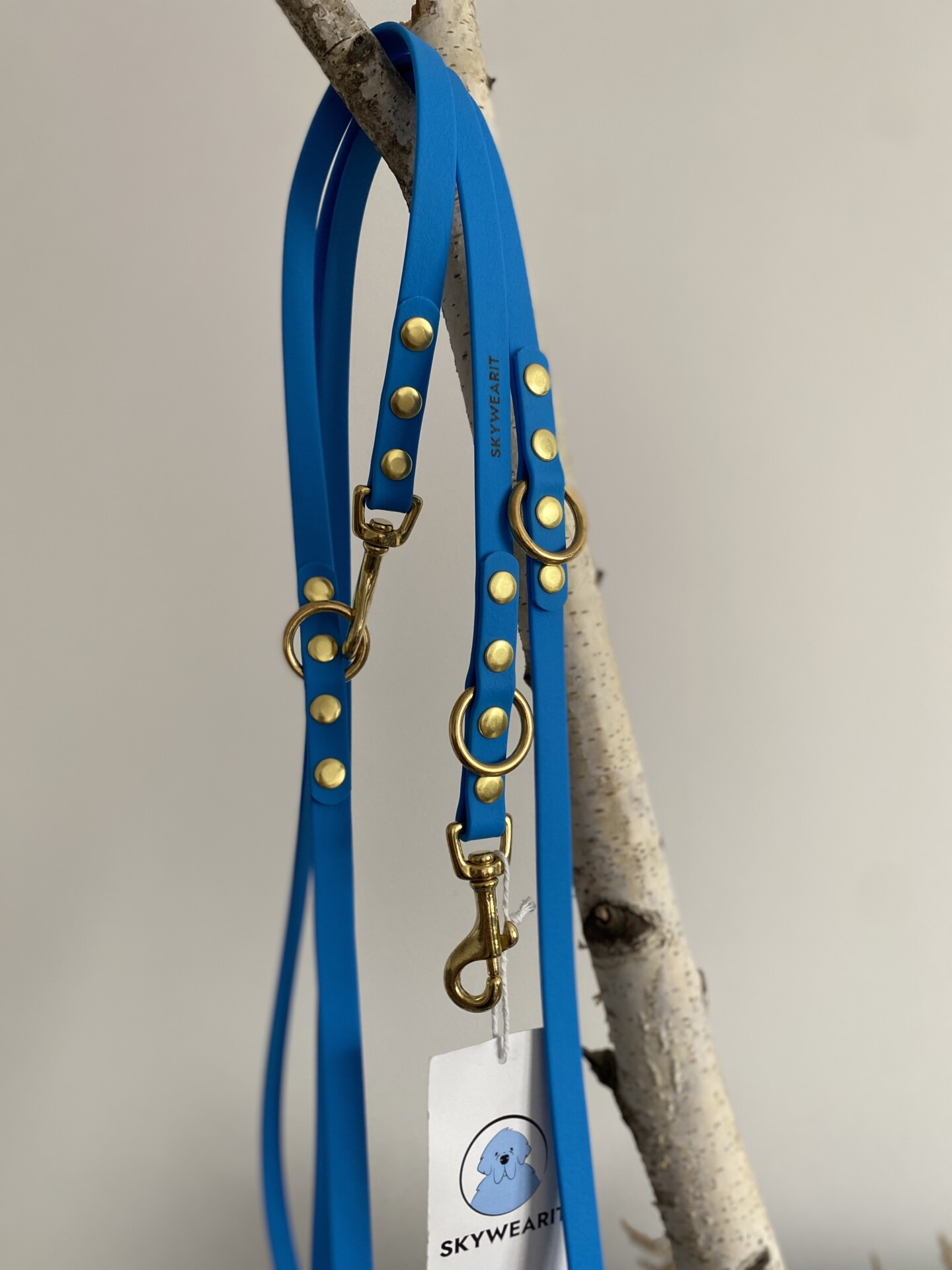 Smycz przepinana w kolorze niebieskim, to idealne rozwiązanie dla każdego psiarza – posiada 3 opcje zmiany długości (można np. przełożyć ją przez ramię i mieć wolne ręce, skrócić lub wydłużyć kiedy jest taka potrzeba). Zbudowana jest z wodoodpornej taśmy, 2 karabińczyków oraz 3 kółek/półkółek, aby móc w każdej chwili wygodnie zmienić jej długość.