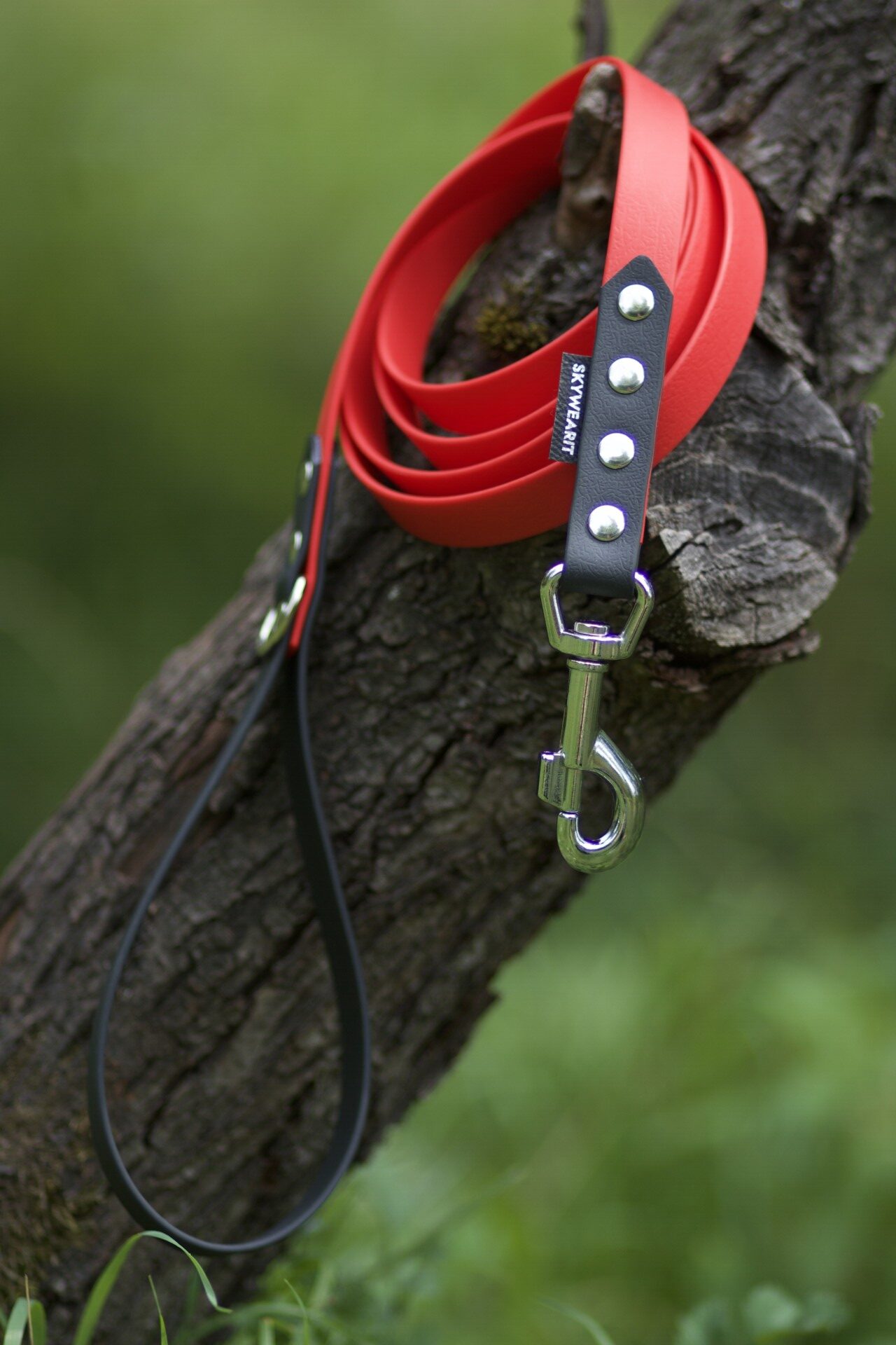 Smycz z wodoodpornej taśmy TPU/PVC nie chłonie wody i błota, nie przeciera się i nie zaciąga. Nie plącze się też psu wokół łap i pomiędzy krzakami. Nie wplątuje się w dłuższą sierść oraz nie zbiera spacerowych skarbów typu liście, igły, małe patyczki itd.